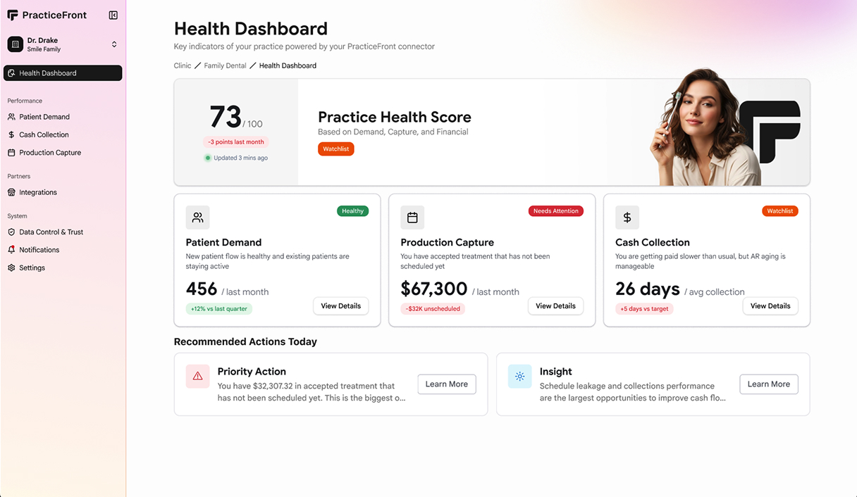 Connect to practices already running PracticeFront. No custom installation, no setup calls—just flip the switch and start syncing data.